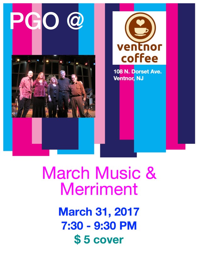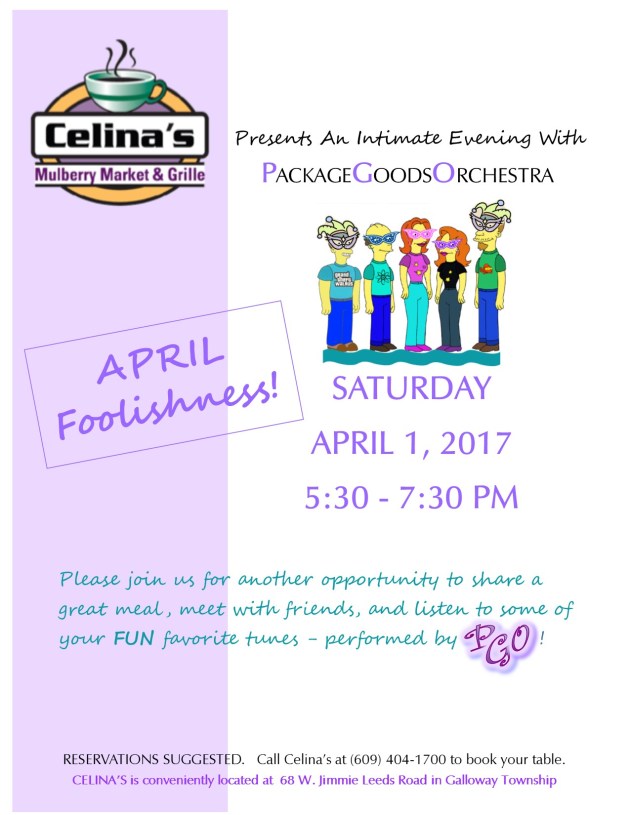 And on April 1st, we’ll be playing a dinner set starting at 5:30 at the lovely Celina’s Mulberry Market and Grille, 68 W. Jimmie Leeds Rd. in Galloway. Reservations are recommended, 609-404-1700. Seating starts at 5 PM. Great atmosphere, scrumptious food and fun music by PGO. We’re so thankful for this amazing new venue to sing and play. And, hey, it’s April Fools Day…you never know what crazy tunes we’ll dig up!